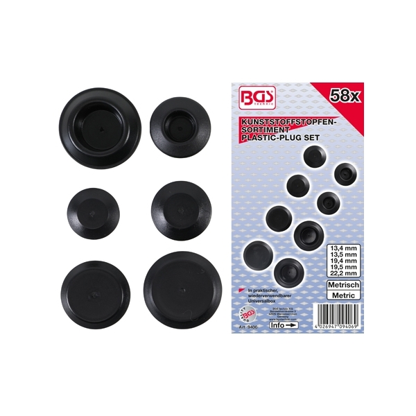 58 stuks kunststof afdichtdoppen, geleverd in een kunststof opberg doos.