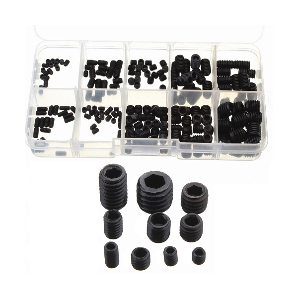 Borgschroeven in de volgende maten: 10 x M3x5mm 10 x M4x5mm 10 x M5x6mm 50 x M6x6mm 20 x M6x10mm 50 x M8x10mm 20 x M8x12mm 20 x M10x10mm 10 x M10x12mm