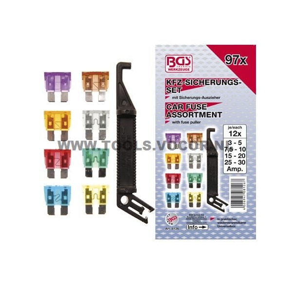 96 delige steekzekeringen set, inclusief gereedschap voor de- en montage.