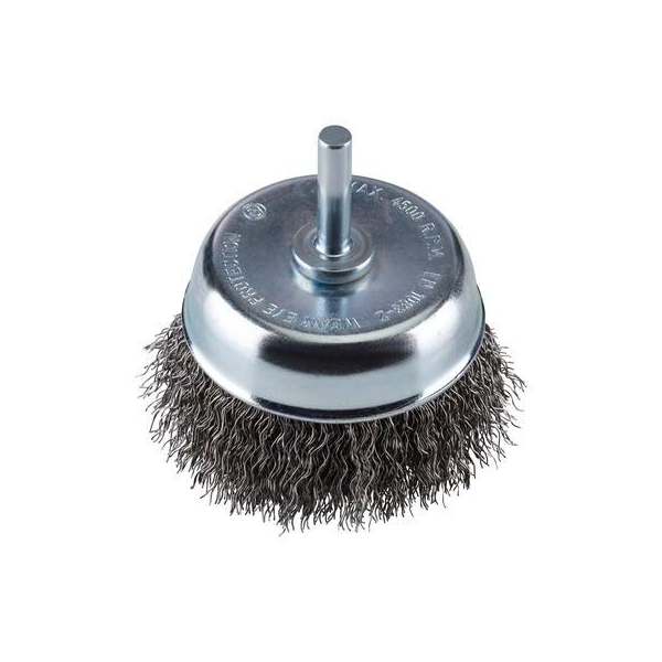 Komborstel met gegolfde staaldraad met 6 mm as voor het gebruik op boormachines. Met een hoog maximaal toelaatbaar toerental.