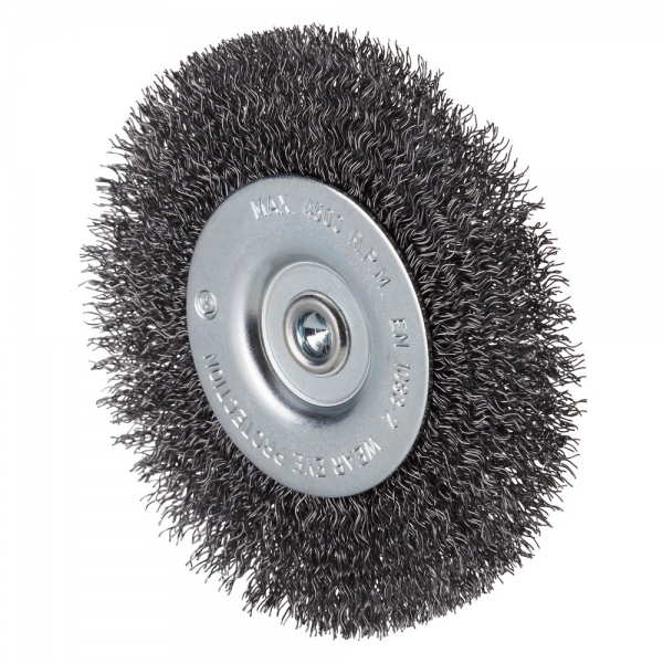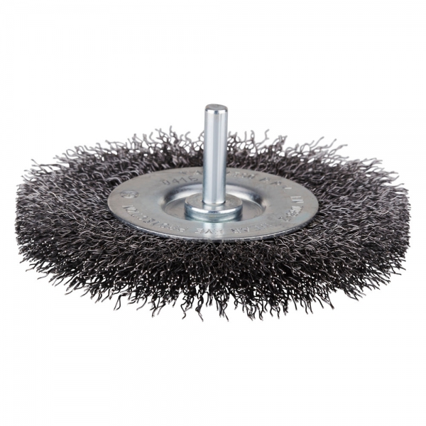 Radiale borstel met gegolfde staaldraad met 6 mm as voor het gebruik op boormachines en/of stiftslijpers.