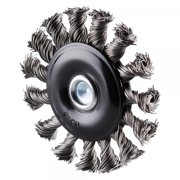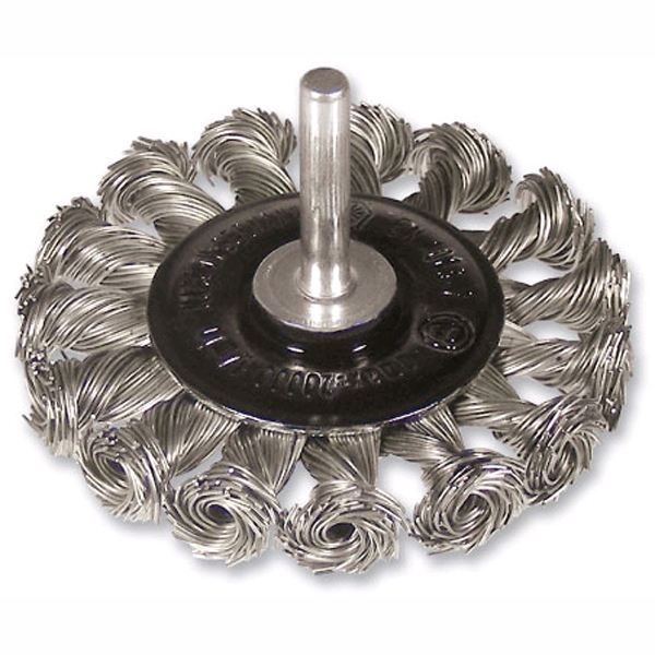 Radiale borstel met getordeerde staaldraad met 6 mm as voor het gebruik op rechte slijpers en buigzame assen.