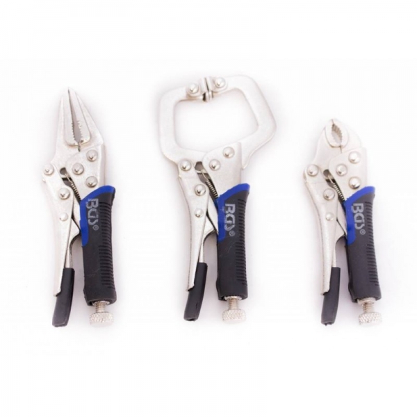 Een set met drie vergrendelbare griptangen om bijvoorbeeld te lassen plaatwerk stevig vast te klemmen maar ook te gebruiken voor talloze andere toepassingen.