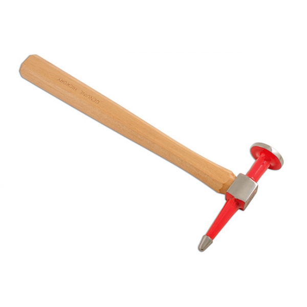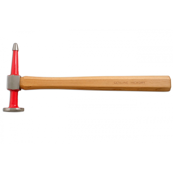 Een kant van de hamer is bol, de andere taps uitlopend naar een bolle punt.