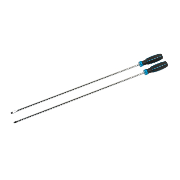 Extra lange schroevendraaiers, een platte en een kruiskop met magnetische punten en zachte, comfortabele handgrepen.