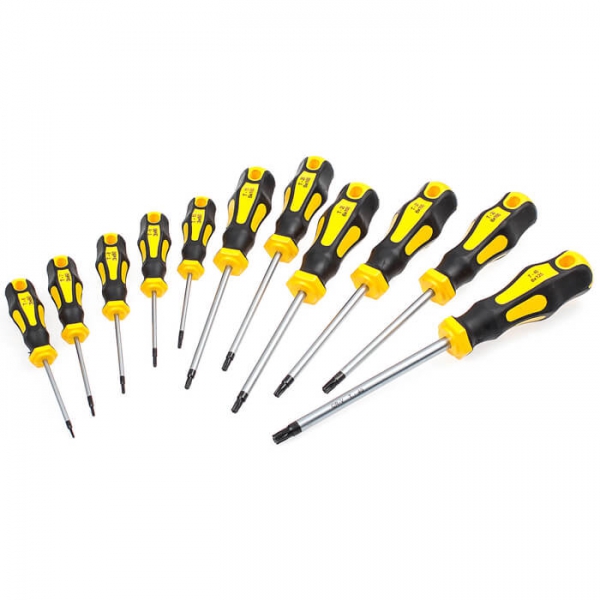 11-deige set Torx schroevendraaiers met magnetische tip en boring, voorzien van ergonomische rubberen anti-slip handvaten.