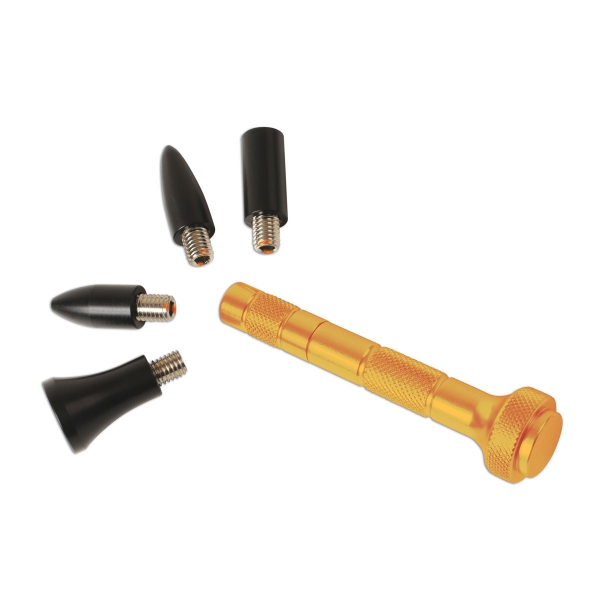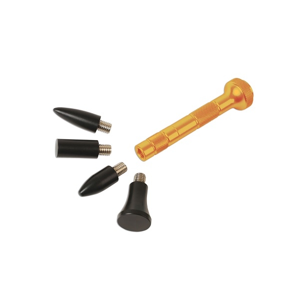 De tool is gemaakt van aluminium en is licht en goed uitgebalanceerd, met een gekartelde grip, zodat het veilig en nauwkeurig kan worden gehouden. Vier verwisselbare koppen zijn voorzien (parallel plat, taps toelopende vlak en twee puntige maten) voor het terugbrengen van hoge plekken en het terugdringen van de hoge gebieden die na het uitdeuken zijn ontstaan.