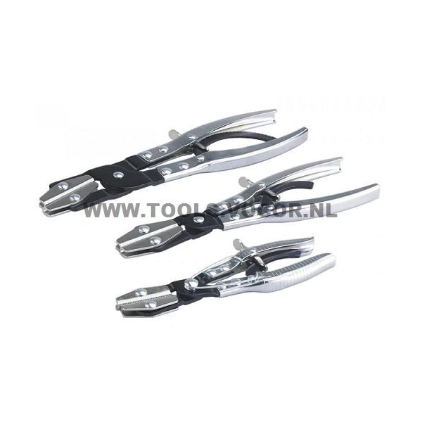 Set van 3 stuks zwaar uitgevoerde metalen tangen om slangen tijdelijk af te sluiten.