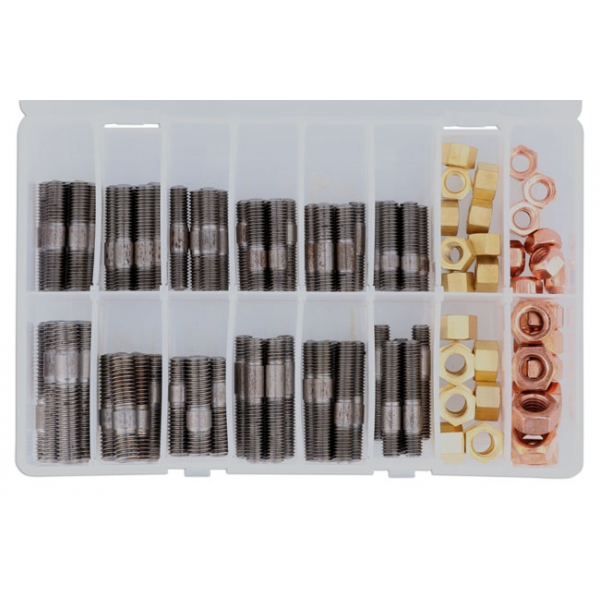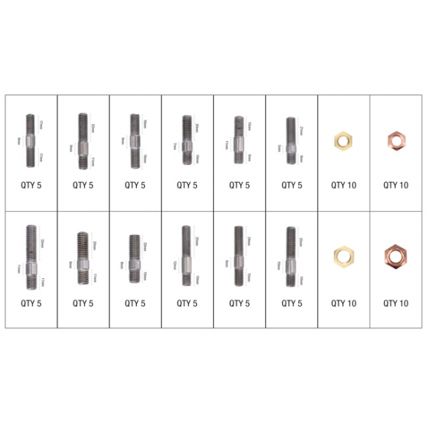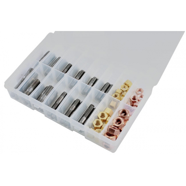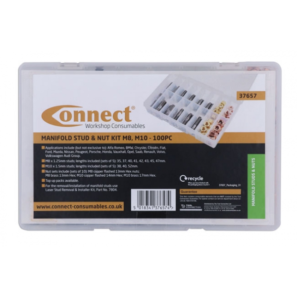 De set bevat 100 geselecteerde spruitstuknoppen/moeren van de meest voorkomende M8 en M10 afmetingen, geschikt voor zowel het inlaat- en uitlaatspruitstuk